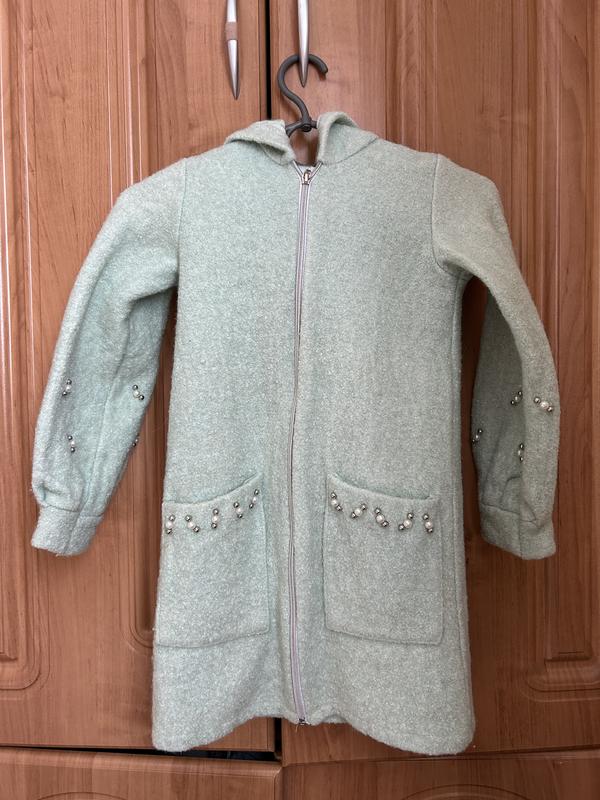 Кардиган у бірюзовому кольорі, оздоблений перлинами на рукавах та передніх кишенях Довжина 62 см , рукав - 42 см від плеча Є капюшон