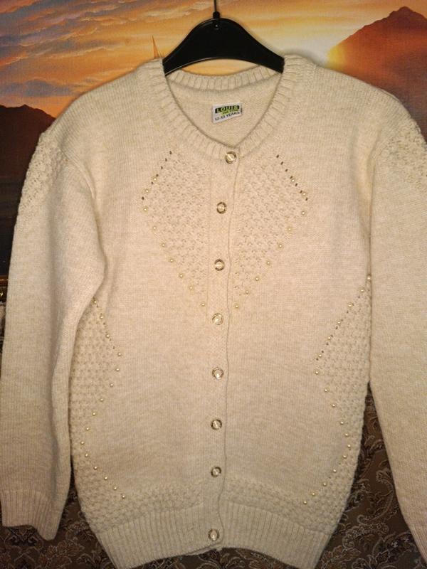 В'язана кофта світло-бежевого кольору з красивими гудзиками прикрашена декором з іншого виду в'язки і білими перламутровими перлинами рукава, комір і низ- гумка(не розтягнута) Довжина від плеча-55см, ширина під рукавами-37 см, рукав-48 см, плече-12 см, плечі-40 см