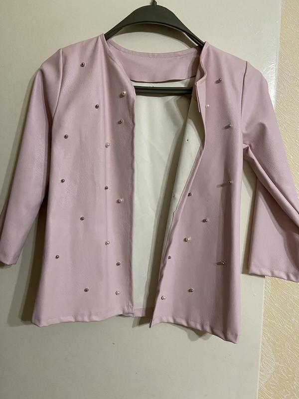 Дуже ніжний і красивий кардиган-накидка. Був одягнений на випускний дитячого садка та все. Більше не став у нагоді. Без підкладки. Кожзам, ніжного нюдового/рожевого кольору з вшитими бусинками. Розмір 116-122 орієнтуйтеся за вимірами. Без недоліків. Виміри: Довжина - 52 Ширина - 33 Плечі-31 Руково-40