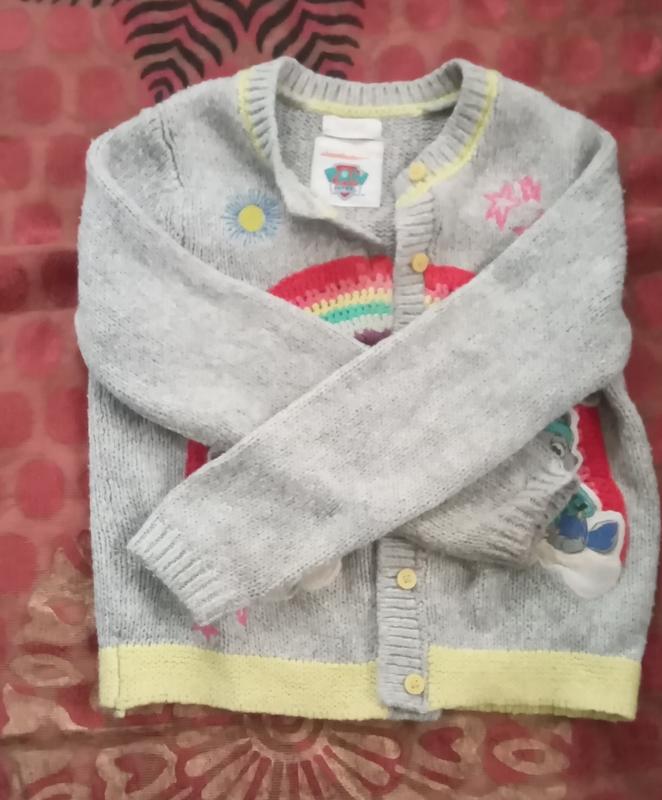 дитячий в'язаний кардиган сірого кольору з різнокольоровими нашивками, зокрема з веселкою та персонажами "Щенячого патруля". Подібні дитячі кардигани з принтами популярних героїв або яскравими елементами