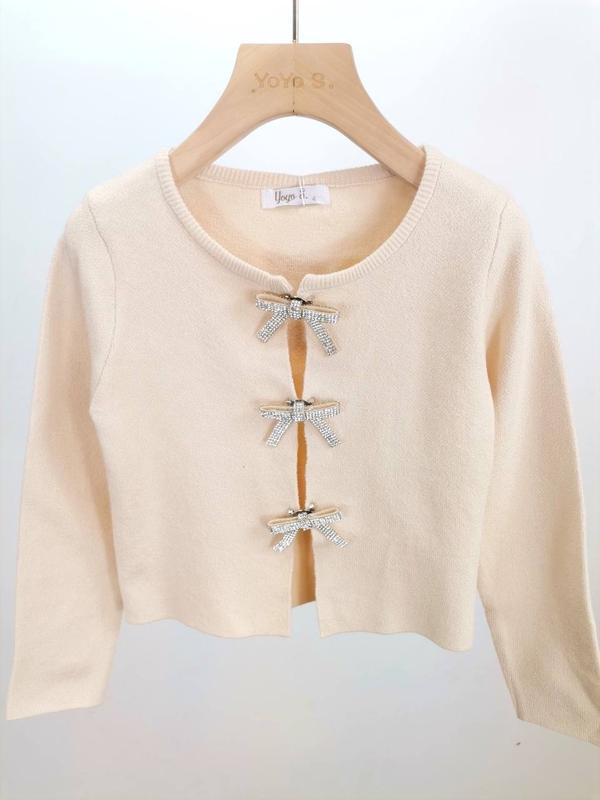 Кардиган для дівчинки. В’язане полотно високої якості. Світло бежевий колір. Три вишукані застібки-брошки із стразами.