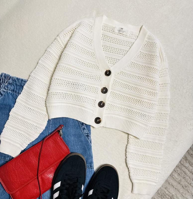 Кардиган від H&M молочного кольору Розмір 8-10 р на зріст 134/140 см 100% котон По грудей 40 см Рукав 56-43 см Довжина 35 см