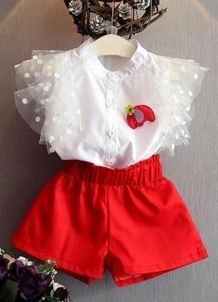 🔷️В НАЛИЧИИ 🔹️Красивый нарядный костюм для девочек с брошкой 🔹️блузка на пуговках, на рукавах шифон , блуза хлопок , качество супер , шорты по типу вискоза на резинке и свободный крой 🔹️Размеры🔹️ арт11: блуза длина 44 пог.34 , шорты дл.25см