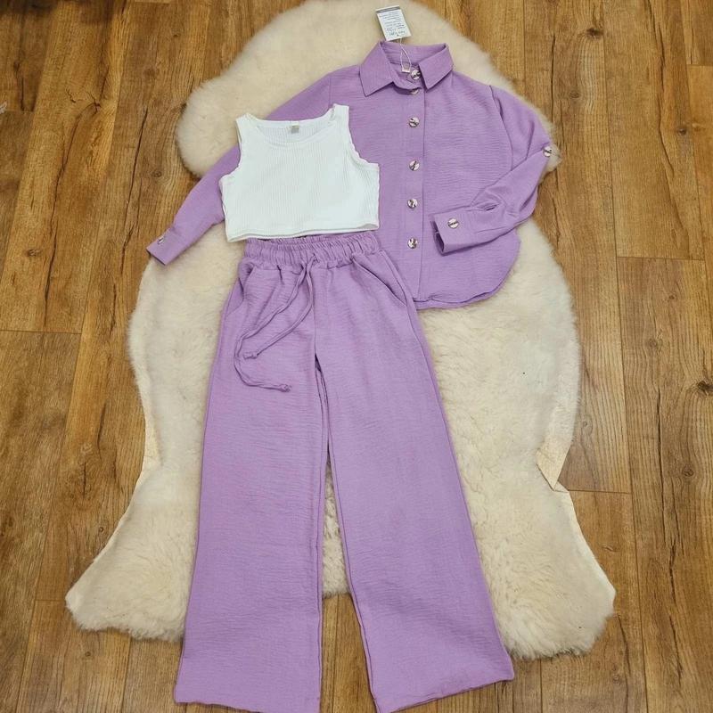 Внаявності 📌 Стильний костюмчик трійка(сорочка+топ+штани) Тканина американська жатка,топ рубчик Рукав робиться короткий Сорочка застібається на гудзики В штанах резинка ЯКІСТЬ ЧУДОВА! РЕКОМЕНДУЮ! заміри:довжина сорочки/пог/рукав/ довжина топа/пог/довжина штанів/крок/пот/п**********/26/31/79/58/25/40 140-53/41/50/28/32/83/63/25/40 158--58/46/56/32/37/98/76/27/45 164-60/47/58/33/38/100/78/28/46