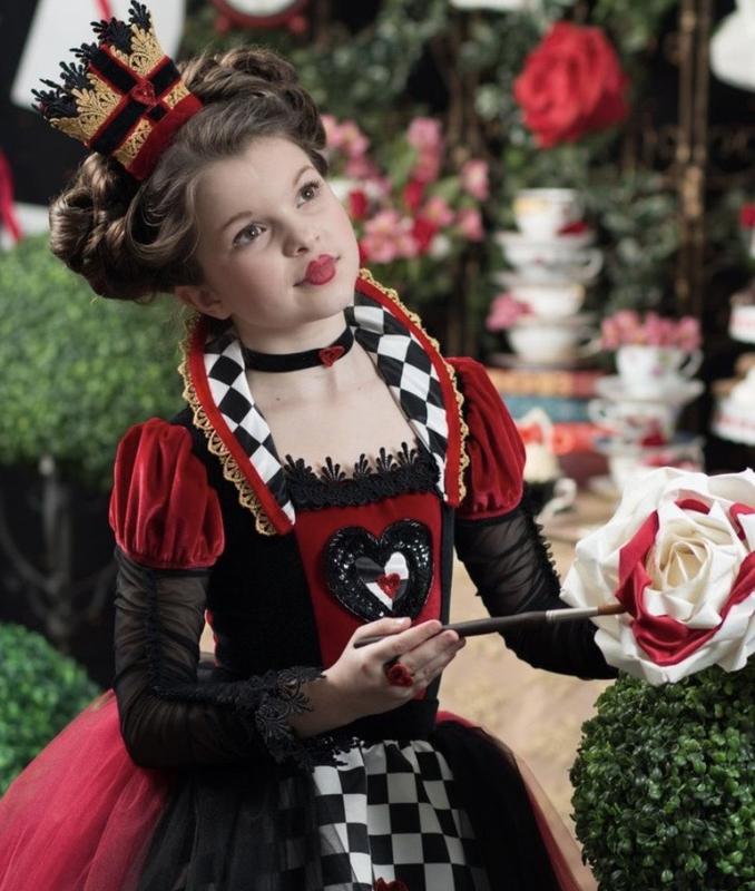 Сукня виконана в червоному, білому та чорному кольорах, з таких матеріалів, як поліестер, спандекс, сітка та оксамит (velour/velvet). • Верхня частина сукні (ліф) має чорно-червоний колір. Рукава пишні червоні у верхній частині та прозорі чорні сітчасті з мереживними манжетами у нижній частині. • Характерною деталлю є високий комір-стійка, виконаний з картатої атласної тканини з декоративним золотим оздобленням по краю. • Багатошарова спідниця складається з цупкої бавовняної основи, покритої кількома шарами -сітка, полістер, тюль- що надають їй обʼєму, нижній край поділу прикрашений золотим оздобленням по низу. •На грудях сукні є аплікація у формі серця, оздоблена паєтками, такі аплікації з паєток чорного і червоного кольорів є спереду спідниці. Застібка- блискавка ззаду. Довжина від плеча до низу-109, 5см Довжина від плеча до поясу-32 см Пояс-29 см Плечі-29 см Рукав-53 см еластична сітка