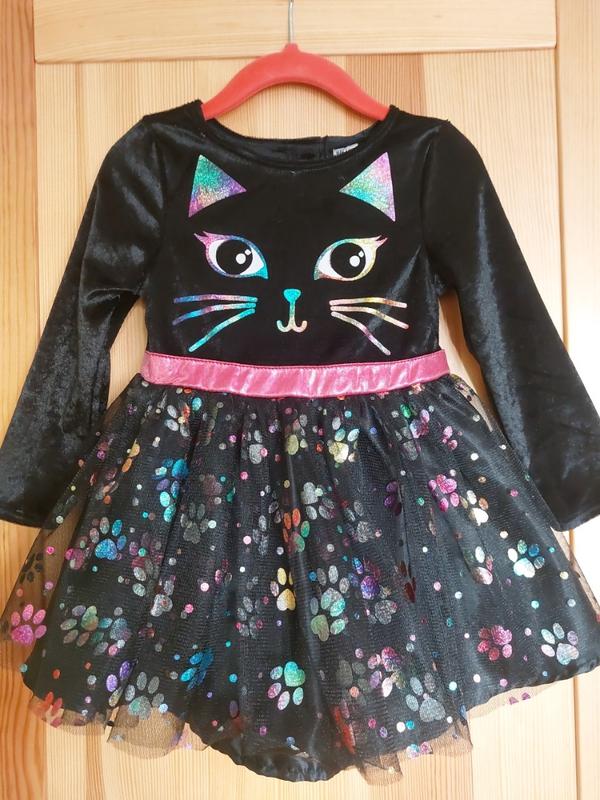 Чудове платтячко для св'ята ,карнавалу ,з довгим рукавом (32 см) ,плечі 22 ,ПОГ24 ,ПОТ 25 ,довжина 47 ,аплікація-мордочка киці ,на спідничці різнокольорові лапки-сліди