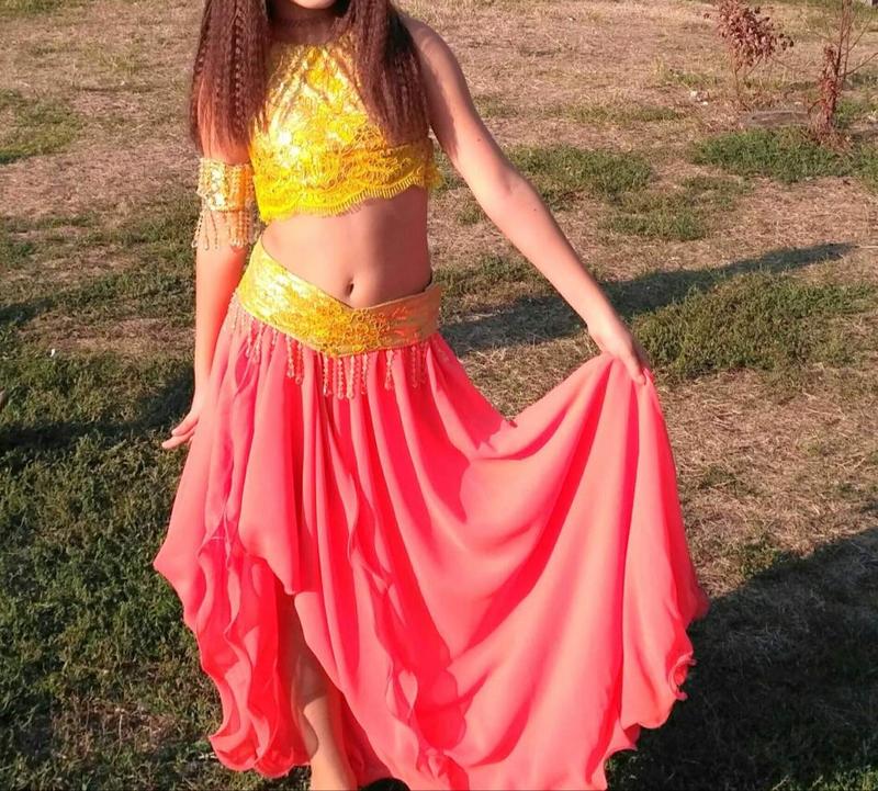 східний костюм для дівчинки. На ріст 128-140. У комплекті дві спідниці, топ, пояс, браслети.