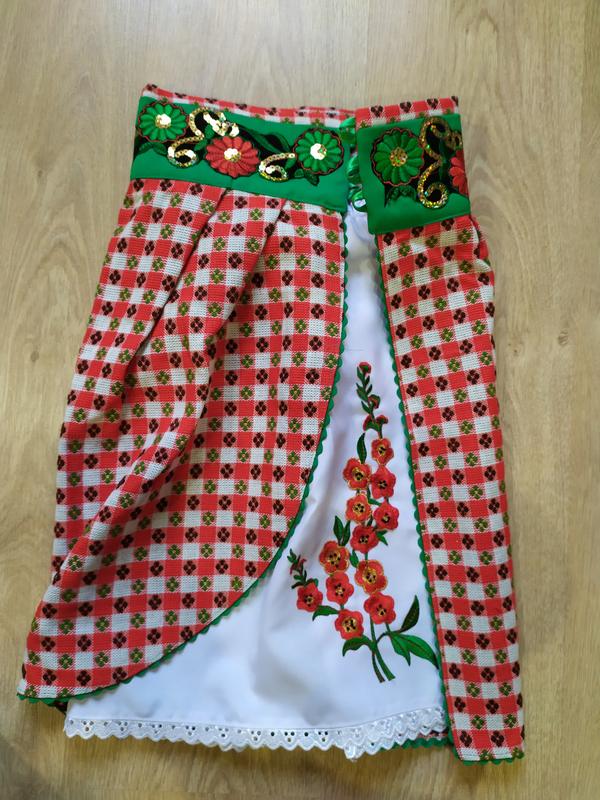 Зріст 128 Верхня спідниці: довжина спідниці 45 см, пояс: ширина 45 см і висота 8 см. Нижня спідниця: довжина 40 см і обхват стегон 72 див. Зріст 140 Верхня спідниці: довжина спідниці 51см, пояс: ширина 57 см і висота 8 см. Нижня спідниця: довжина 41см і обхват стегон 80 див.