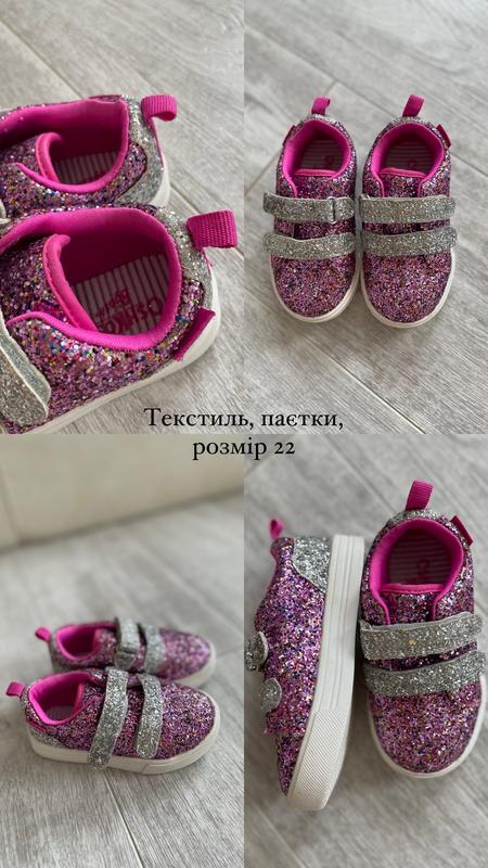 Дуже яскраві та оригінальні кеди, розмір 22. Паєтки не облітають, якісні, на липучках. Всередині на тканинній основі.