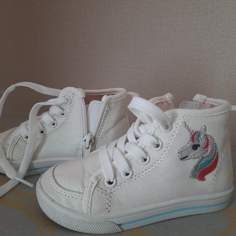 Високі кеди на дівчинку Carter's. Розмір 23, на ніжку до 14 см. З мерехтінням. Виглядають святково. Можна використовувати як повсякденні, зручні. Застібаються - шнурок і блисаква з внутрішнього боку. Стан дуже добре, ідеальний.