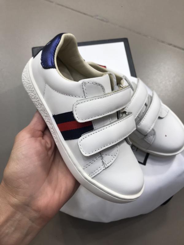 Білі дитячі кеди відомого бренду . Виконані з натуральноі шкіри преміум якості (Calf leather) . Застібка липучка. Легендарна полоска та декоровані логотипом задніки підкорять серце найвибаглівіших батьків! Устілка теж з натуральноі шкіри! Підошва пришита!! Також логотип бренду вказано на підошві! Є коробка , мішечок та папір брендові!