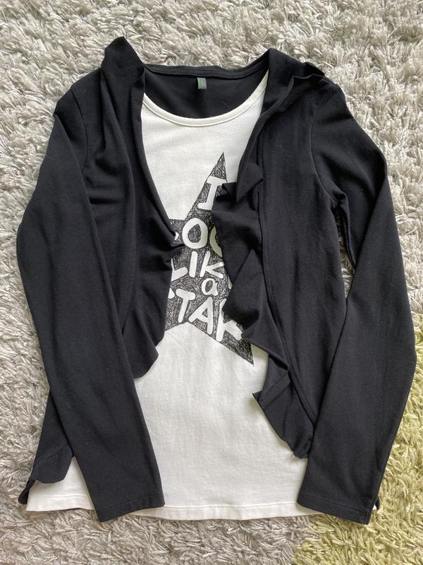 Оригінальна кофточка (обманка) по виду таке відчуття, що на маєчку надітий піджачок, 82% бавовни, взагалі стан нової речі, але є невеликі цятки (останні 2 фото), при носінні не видно, та й думаю при бажанні без проблем можна вивести