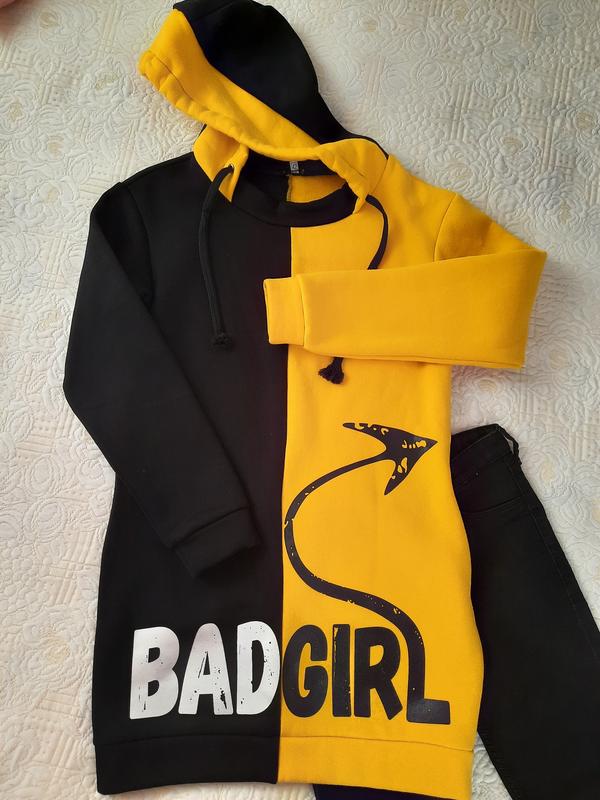 Тепла спортивна туніка , чорно-жовтого кольору (жовтий насичений, кукурудзяний, такий як на фото),з капішоном та кишенями, на флісі ( видно на останньому фото), нова ( не підійшов розмір),хорошої якості, не кошлатиметься. Заміри: довж- 76 см, ПГ- 45см, довж рукава від шва плечей- 55см, ширина низу- 42см