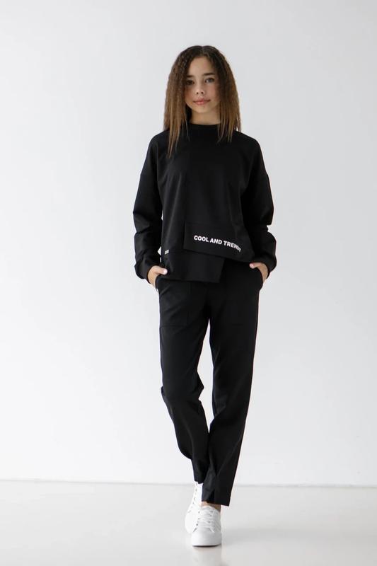 Кофта оверсайз со спущенным плечом, вшивным длинным рукавом на манжете из основной ткани. Кофта с двухниточные. Горловина оснащена пришивной планкой. На передней половинке асимметричный рельеф по нижним краям. Украшенный по низу пришивной манжетой которая в боковом шве переходит в распорку. Низ передней половинки асимметричный с выступлением которой пришита манжета переходящий в распорку по боковому шву. Низ задней половинки украшенный манжетой дополняющий передний. По манжете асимметричного рельефа нанесен принт. Размер 140 146 152 158 164 Длина 50 52 54 56 58 Пройма 44 45 46 47 48 Рукав (от горловины) 59 61 63 67 69