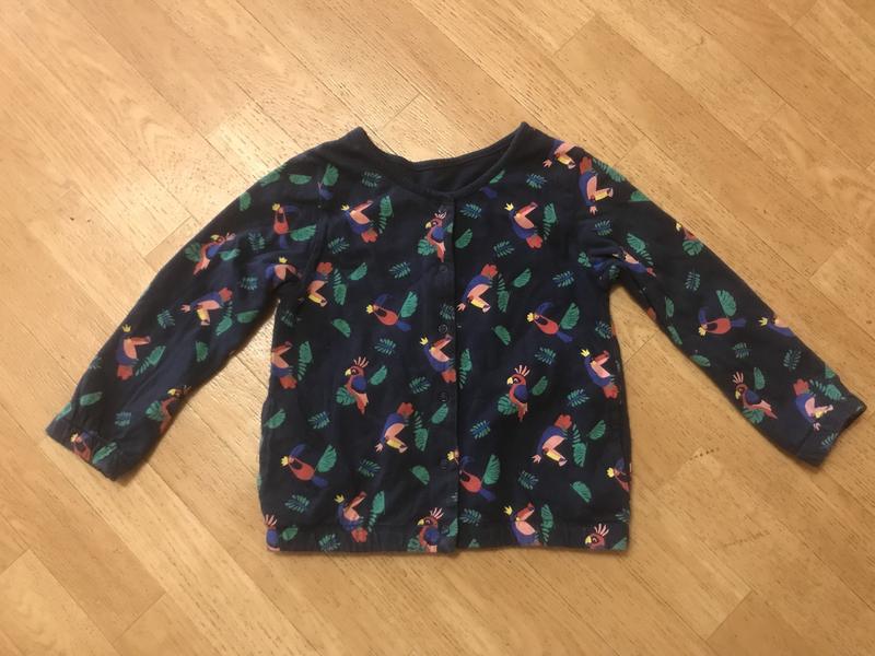 Кофтинка на дівчинку 6 років, носиться на дві сторони, одна кольорова, друга темно синя, довжина 39 см, ширина по грудях 33 см, довжина рукава 35 см