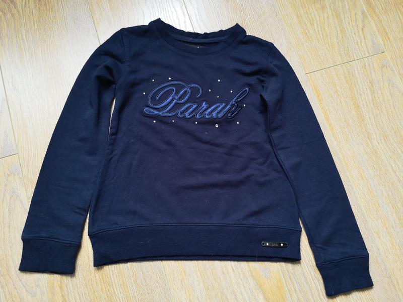 Дуже класний світшот, висока якість. М'який, приємний на дотик, важка тканина (не тонка) Відмінний склад віскоза 95%, еластан 5%. Фврма Parah. Спереду аплікація з вишивкою. Глибокий темно - синій колір. Довжина 41см Рукав 42см ПОГ 30см