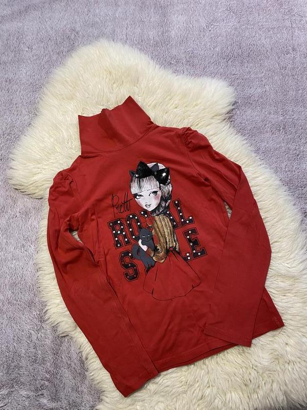 Фото На тілі немає) виміри на фото)гарна кофта з симпатичним малюнком,комір стійка гольф,рукава довгі на плечах складки-ліхтарики,на грудях малюнок-дівчинка з бантом -дэкор ) Лого Here + Here There + There – демократичний стиль, лояльні ціни і жіночність для дітей і підлітків від 7 до 14 років. З повагою до їх думку, до їх вибору. Одягатися модно і при цьому без зайвих витрат цілком можливо. Одним з найбільш потужних квітів у всій кольоровій гамі вважається червоний. Червоний – насамперед, колір пристрасті, сильної енергетики. ... Це символ повної життя, краси, величі, але, разом з цим, він володіє енергією тепла, любові і комфорту. Гольф (або водолазка, бадлон) — тонкий, облягаючий тіло светр з високим, вузьким, зазвичай отворачивающимся коміром