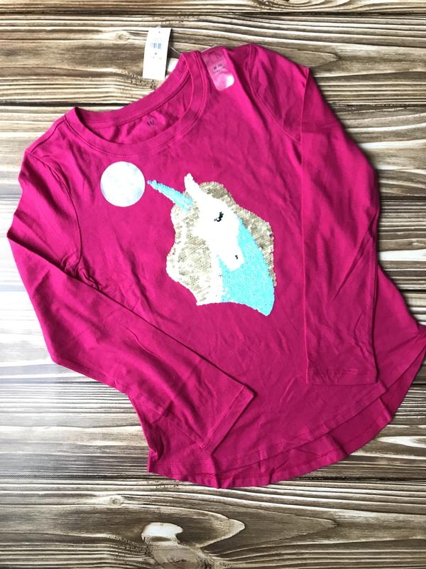 Яскравий реглан з єдинорогом від відомого американського бренду GAP. Оригінальне поєднання матових та глянцевих пайєток. Трикотаж цього бренду не перекручується після прання, добре тримає форму та колір. Розмір 8-9 років 128-134 см зріст, заміри: довжина від плеча 50 см, ширина по груді 38 см, довжина рукава від плеча 48 см Ціна набагато менша, ніж в магазині ( як бачите на фото )