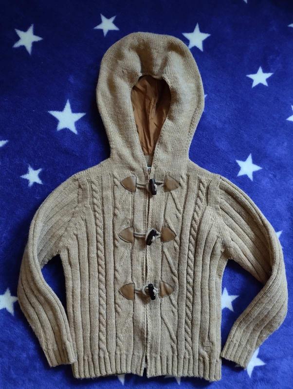 Нова напіввовняна кофточка з каптуром на осінь для дівчинки 5-6 років на зріст приблизно 116 см. Колір - кава з молоком. Гарний в'язаний візерунок. Дерев'яні пуговки. Заміри: плечи 27, рукав від плеча 41, ПОГ 37, ПОТ 31, довжина без каптура 40. Вир-во Іспанія.