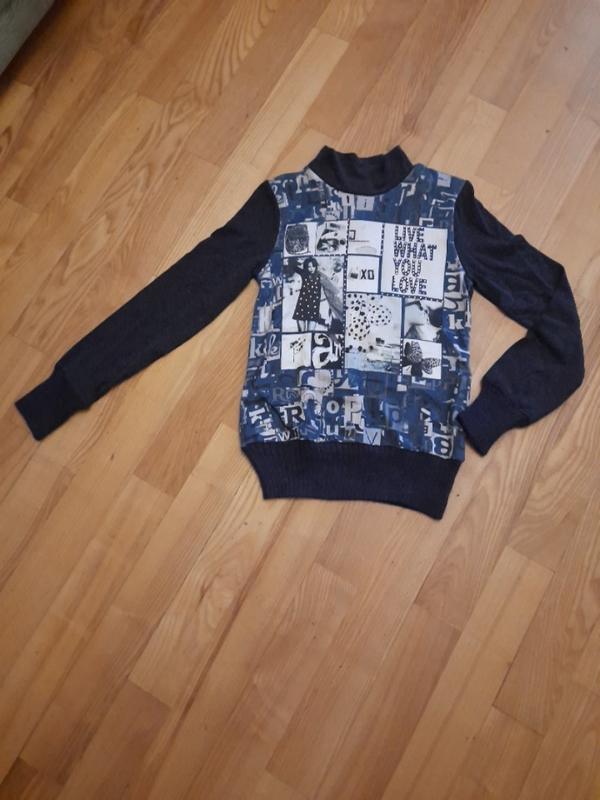 реглан для дівчинки комбінований :з переду трикотаж з малюнком , з камінчиками, які не відпадають ; спинка вязана ажуром на трикотажній підкладці ; рукава з теплої тоненької трикотажної тканини і стоїчка на комірці, манжети на рукавах і низ виробу на резинці. Якісна, практична , оригінальна і тепла кофточка для худенької красуні на ріст 128 ( відповідає на 134-140см ), по плечах 30см, об'єм по грудях 68см , довж рукава 55см (манжет 8см), довжина 51см по спинці Відправляю нова пошта , укрпошта , наложеним по предоплаті , безпечна оплата на шафі
