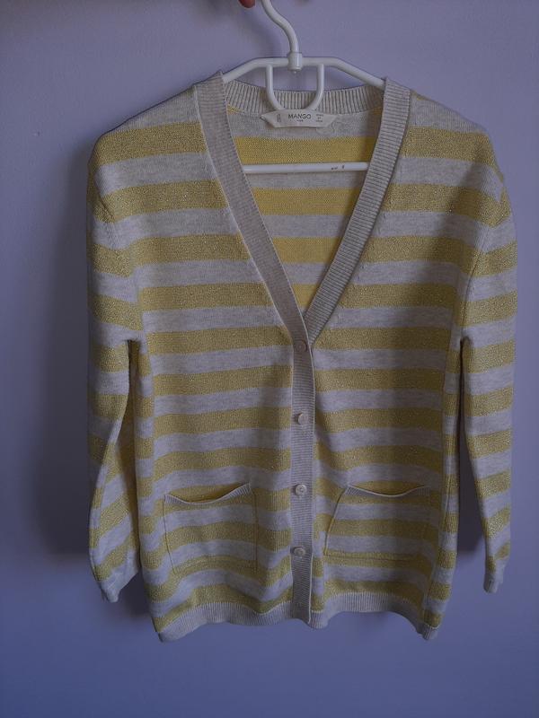 Дуже гарненький та стильний кардиганчик на гудзиках з люрексовою ниткою, фірми Mango. Спереду кишеньки. Розмір 122 Рукав від коміру 51 см Ширина - 41 см Довжина - 52 см Ідеальний стан