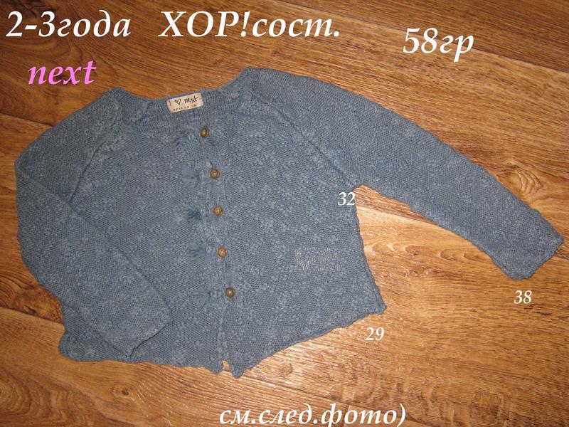 кардиган від Next, 2-3 роки(бирка) . Нюанс в тому, що кофточка жорсткувата..треба відпарити( в іншому все відмінно. б/дефектів. ОБОВ'ЯЗКОВО!дивіться виміри і додаткове фото. Приємних покупочек) Рекомендую дивитися всі мої оголошення. В наявності ЩЕ БАГАТО речей!