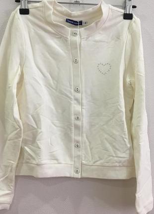 Мила класична кофточка з тканинними гудзичками і серцем з страз. Трохи утеплена. Розмір 8 {128}. Довжина рукава від плеча 47, по внутрішньому шву 38,5, ширина під грудьми 36, довжина по спині 42
