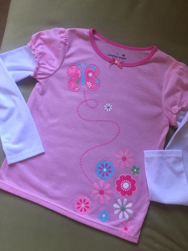 Ніжний та роаничный реганчик рожевого кольору з білімі рукавами і зверху з Рожеве ліхтаріком, з красивою аплікацією з бліскіткамі, на 10 років. Дуже якісний поліестр. Заміри: довжина по спінці 49, довжина рукава від плеча 54 див.