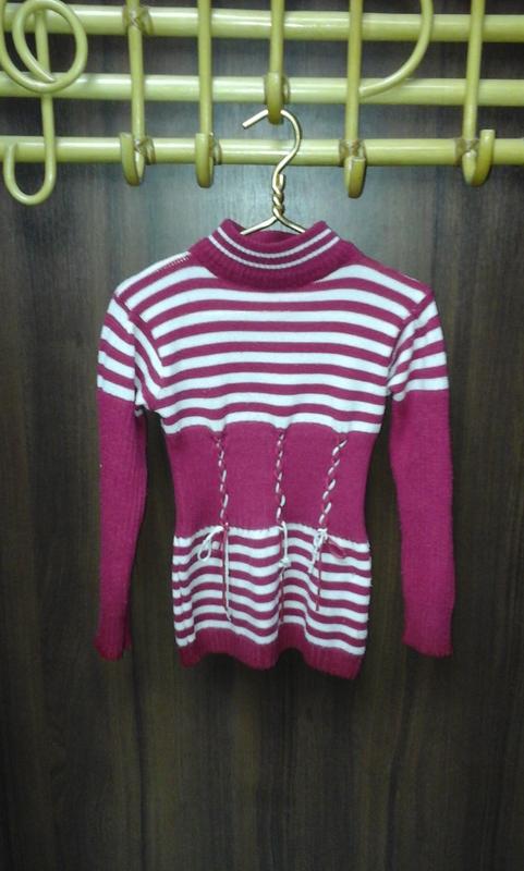 Джемпер, свитер кофта для девочки. Возраст 3 - 4 лет, рост 104см. Яркая расцветка в красно - белую горизонтальную полоску. Удлинённый, с контрастным узором по линии талии. Очень тёплый и мягкий, из полушерстяной пряжи. Длина 45см, окружность груди 66 см, длина рукава 40см. В очень хорошем состоянии.