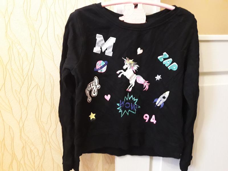 Стильный свитшот девочке внутри начесик небольшой, яркий принт с блестками, по бирке на 8-10 лет. Состояние отличное.Длина от плеча до низа 41 см ,длина рукава 49 см ,Пог 39 см
