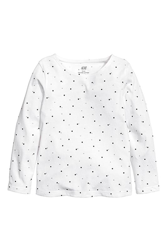 Оригінальний лонгслив від бренду H&M розм. 134-140(8-10років) № **********-02 Мірки: плечі 30см, пог 35см, довжина 48 см, рукав-48 см CONSCIOUS. Трикотажний лонгслив з принтом-горошок, з довгим рукавом з органічної бавовни Колір: білий/горошок