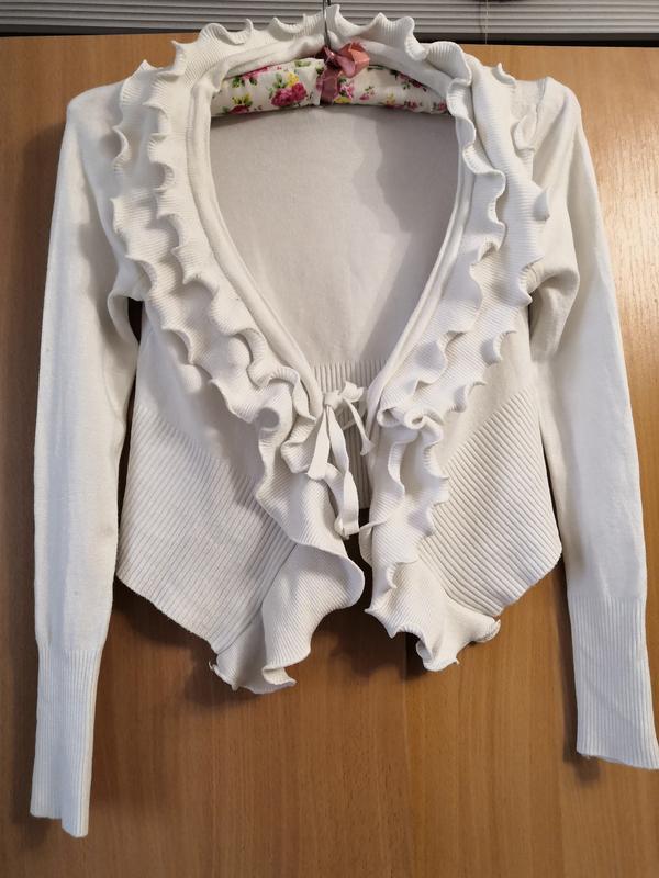 Кофта- свитер с рюшами. Размер не указан, бирки срезаны, но дочка носила в 12 лет. Смотрите замеры: длина по спинке 39 см, плечи 34 см, полуобхват груди 38 см, полуобхват снизу 37 см, рукав от плеча 57 см. Если нужно, сделаю дополнительные фото - замеры. Ньюансы видны на 2 последних фото, но в носке не заметны. Ткань приятная к телу.