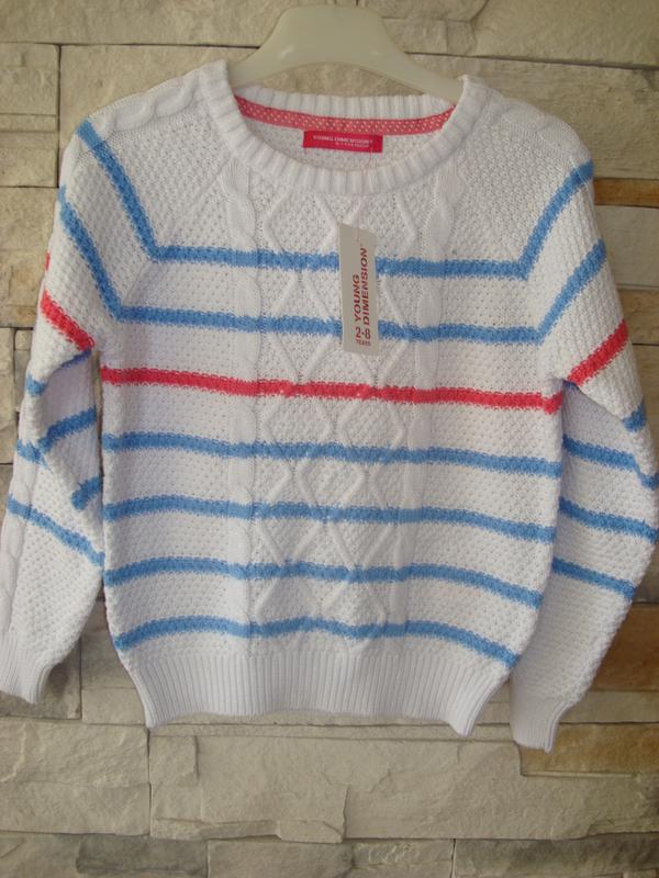 Стильный и модный свитер для девочек от Primark Ирландия. Всегда актуальная полоска! Классическая вязка - косы! Приятная ткань! Отличное качество!! Размер в наличии: 6 - 7 лет (рост 122 см)