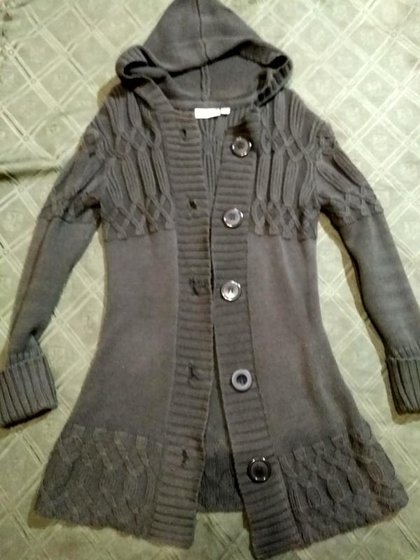 Кофта кольору хаки, в чудовому стані, не кашлатається. Розмір 140-146, довжина 61см, довжина рукава 48см, є поясок.