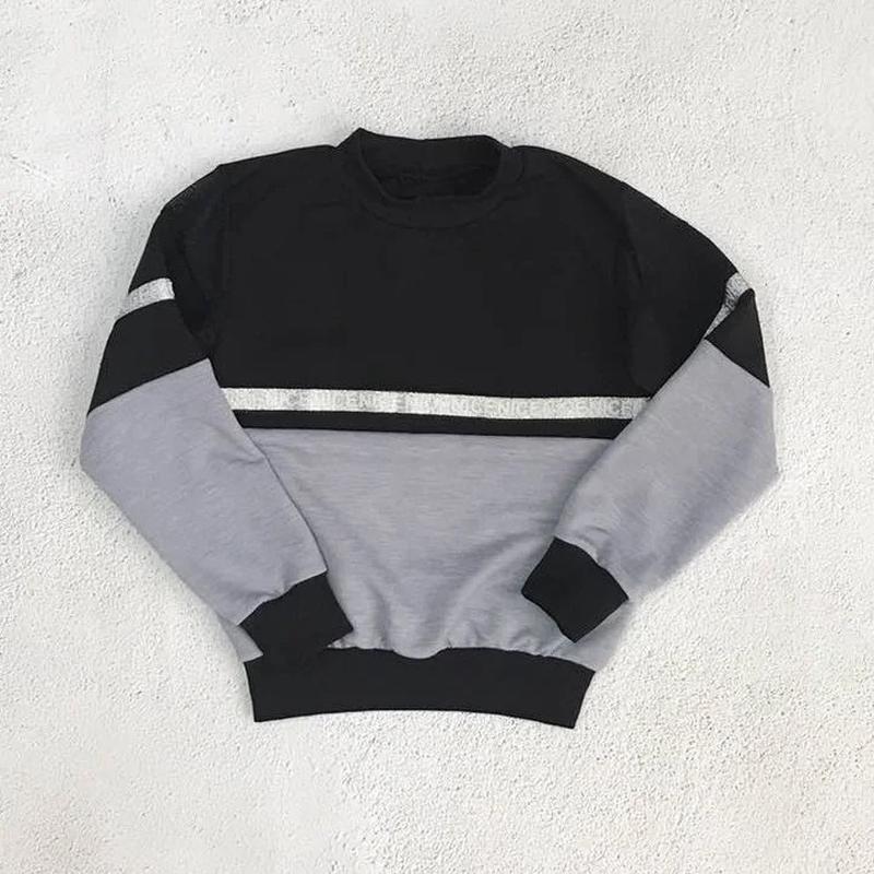 Стильний джемпер для дівчинки з відкритою горловиною, низ виробу і рукавів на манжетах. Прикрашена блискучою стрічкою, на плечах сіточка. Колір: Сірий; Полотно: Футер 2-х нитка без начісування; Склад: 95% бавовна, 5% еластан В наявності Ріст 122 - 102,20 грн.