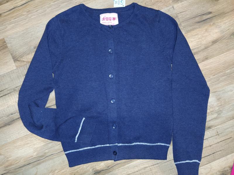Кофта на гудзиках колір темно сірого з синім відтінком !!смужки в низу і на рукавах із срібних ниток люрекс!! якість супер 100% катон!! сток з Польщі!! на ріст 140 ( довжина 45см, ПОГ 35см, рукав від плеча 51см)