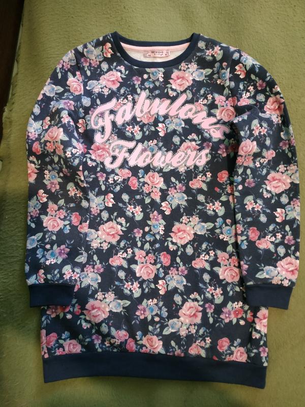 Мила туничка в квітковий принт.Начос.Зазначений ріст 140-146,але большемерит. ПОГ-40см,плечі-35см,довжина рукава від плеча-51,5 см,довжина рукава від плеча-61,5 см,довжина виробу 68см. Можу зробити додаткове фото.Перешлю.