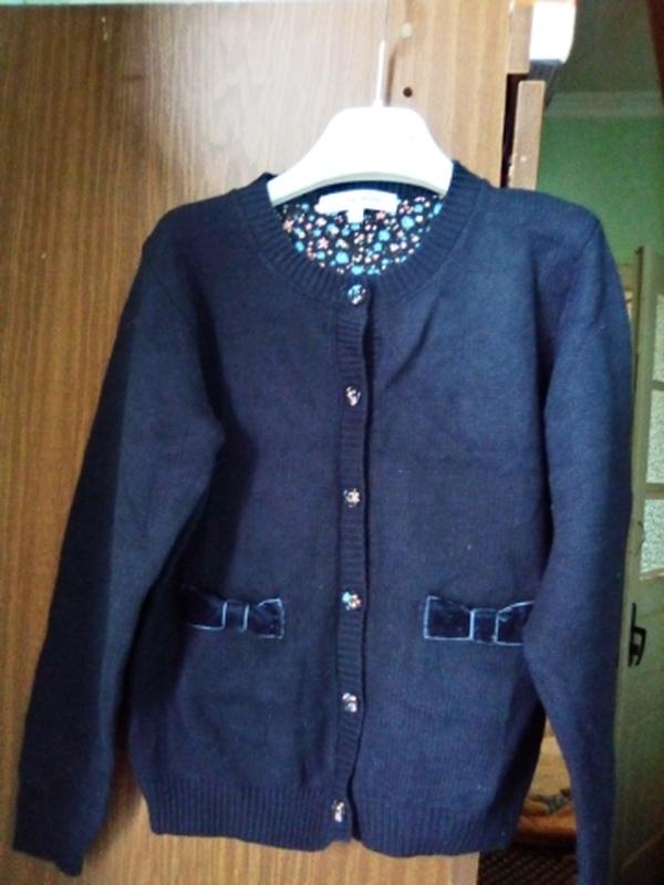 кофточка с карманами, верх карманов оформлен бархатными бантиками, пуговички забраны тканью.длинна 45см., длинна рукава 45см.,плечи 32,5см.,под мышками 40см.и ещё тянется.