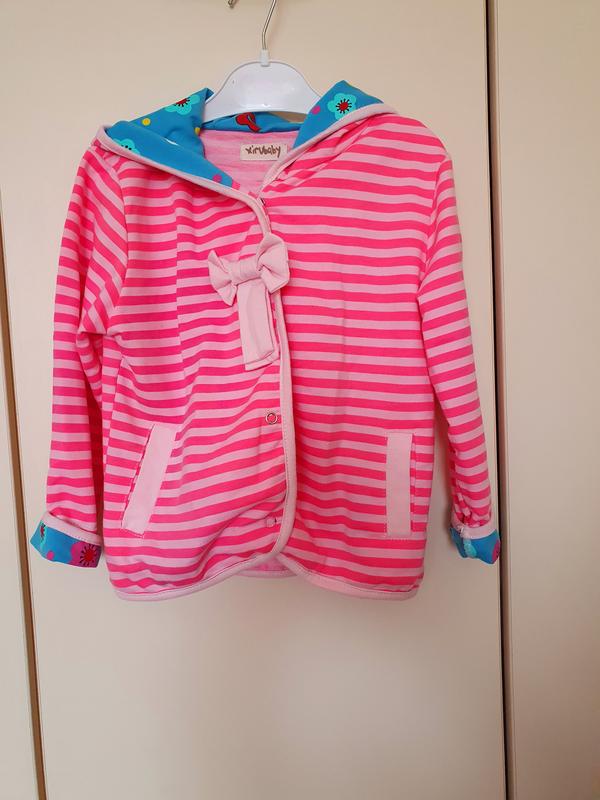 Кофта на кнопках на вік 2-3 роки.Рукав повертається,кольоровий капюшон всередині.Без дефектів.Довжина 38см,рукав-37 см(можна піддати на 6 см).