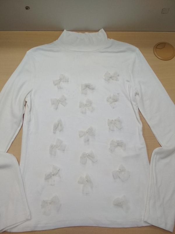 Белый гольф из эластичного трикотажа. Украшен милыми бантиками. Замеры размер 164: Плечи-35см Полуобхват груди-38см Длина рукава-57см Длина изделия-56см Код товара 18416