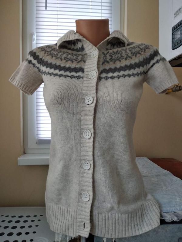 М"якусенький теплий кардиган.Esprit. розмір XS.ніжно сірого кольору. дуже нарядно виглядає в реалі.подовжений. добре гріє поперек. 89 % шерсть, 20 % поліамід. стан відмінний..тільки є один нюансик - на манжеті знизу ( на фото вказала ). довжина спереду 59 см. по спинці з коміром 67 см лінії плеча немає. ПОГ 39 - 49 см. ширина внизу 43 см