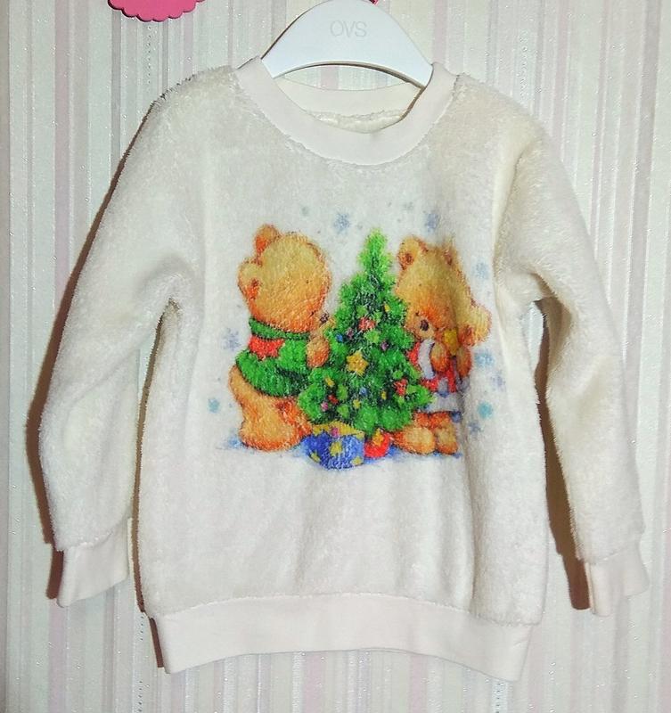 Хутряний молочний світшот із новорічним принтом ведмедиків у розмірі 2-3 роки для дівчинки. Стан відмінний. Заміри: довжина 41, ширина 33, рукав 34,5. При покупці трьох товарів - укрпошта у подарунок!