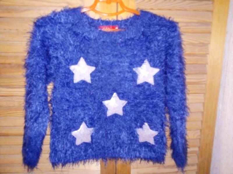 Теплий светр з класним принтом. Дуже практичний у використанні. Колір синій. Не вузький. Стан дуже хороший. Плям, дірок немає. Заміри: Довжина-35 см ПОГ - 30 см Рукав від горловини-40 см Рукав по внутр.шву-26 см
