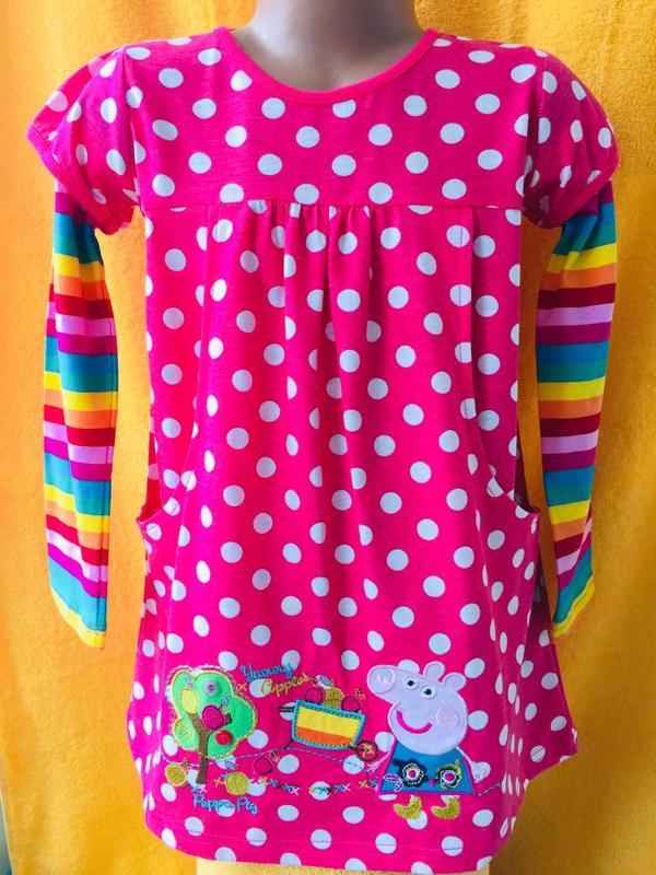 Дуже красиве нарядне плаття . Аплікація Свинка Пеппі Тканина трикотаж склад: 100% соттон Розмір 98 ширина грудей 28см рукав 31см довжина 45см. Розмір 110 ширина грудей 31см рукав довжина 37см 47см. Размер116 Вік 5-6 років ширина грудей 32см рукав довжина 37см 39див Розмір 122 Вік 6-7 років ширина грудей 34см рукав 41см довжина 55см
