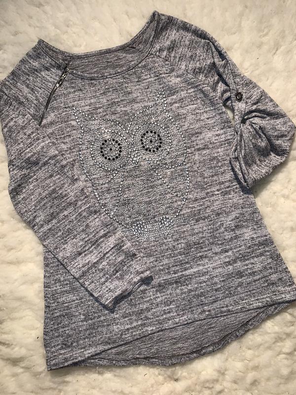 Стан ідеальний Сірого кольору Принт « сова » Блискавка декор Рукав на добірці Низ ззаду заокруглен Замери : Рукав від горловини -59 см ПОГ - 43 см Низ ПО - 47 см Довжина - 58 /64 см
