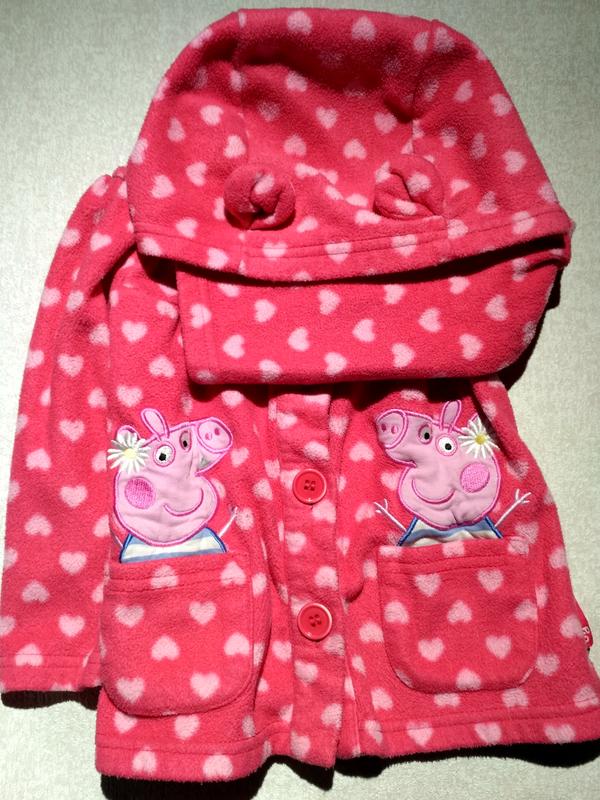 Яскравий, дуже приємний кардиган. Теплий і в тієї ж годину легкий. Розрахований на дівчинку 2-3 років. Є маленька помальовка на одній зі свинок, не пробувала відіпрати, помітила під час фотографування.