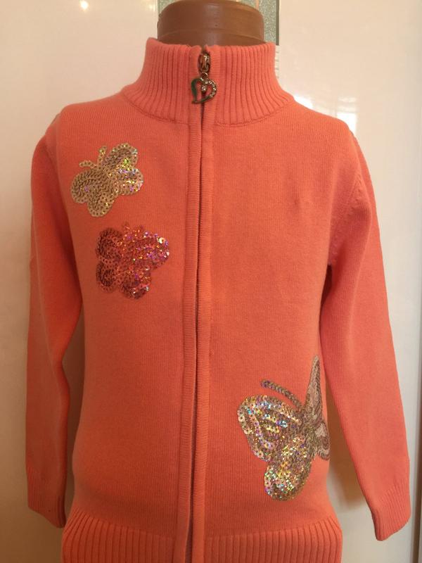 Тепла кофта светр з горлом. На грудях аплікація метелики з паєтками. Кофточка м'яка комфортна . Склад 90% соттон 5% nylon Розмір 90. Ширина грудей 28см рукав 33см, довжина 35см. Розмір 110. Ширина грудей 32см рукав 41см довжина 42см .