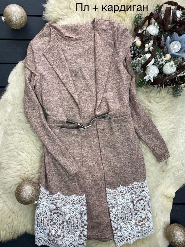 Очень красивый комплект- платье с длинным рукавом и кардиган без рукавов, по низу украшено широким дорогим кружевом Пояс в комплекте Ткань- трикотаж ангора софт, тянется Цвет – пудра ✔ Размеры: 152 – рукав 50, длина 74 158 – рукав 52, длина 79