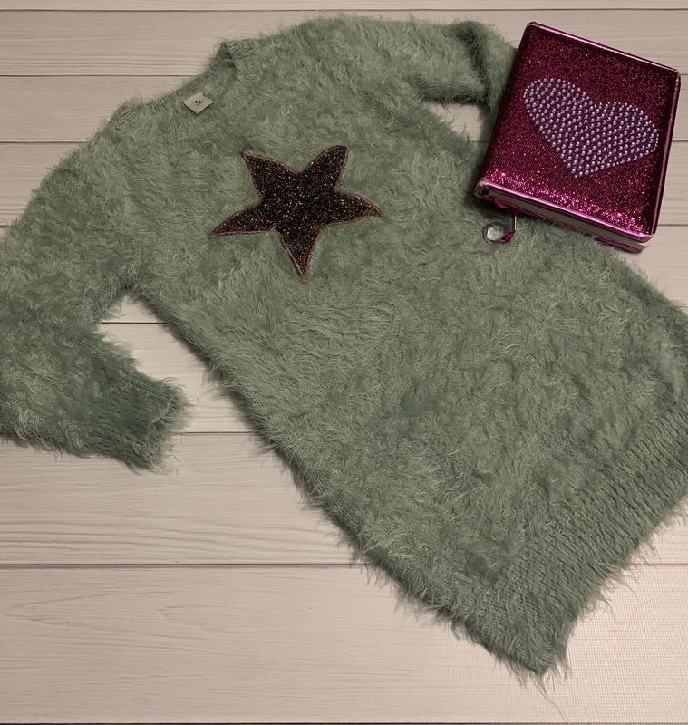 Туніка м‘ятного кольору,з аплікацією з кольорової зірочки.Дуже м‘ягенька.Довжина-62 см.,плечі-31 см.,рукав-37,5 см.Вживу дуже гарна)