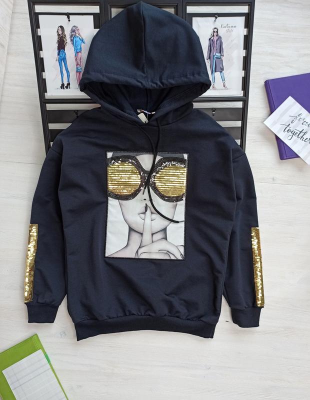 НОВИНКА 🎀 Красивий реглан з капюшоном для дівчинки 🎀 Малюнок нашивка + паєтки(пришиті добре, не рухаються) 🎀 Тканина двунітка 95% бавовна 5% еластан 🎀 Туреччина 🎀 Супер якість🇹🇷 При виборі орієнтуйтеся по замірах! (ЗАМІРИ: ПОГ - напівобхват грудей, РУК - заміри від ГОРЛОВИНИ) 🌈 РОЗМІРИ В НАЯВНОСТІ: ЗІ СПУЩЕНИМ ПЛЕЧЕМ 12-13 років пог 47 см дл 58 см рук 61 см (3 шт) 13-14 років пог 48 см дл 60 см рук 62 см (1 шт) 14-15 років пог 50 см дл 62 см рук 63 см (2 шт) 15-16 років пог 51 см дл 64 см рук 66 см (2 шт)